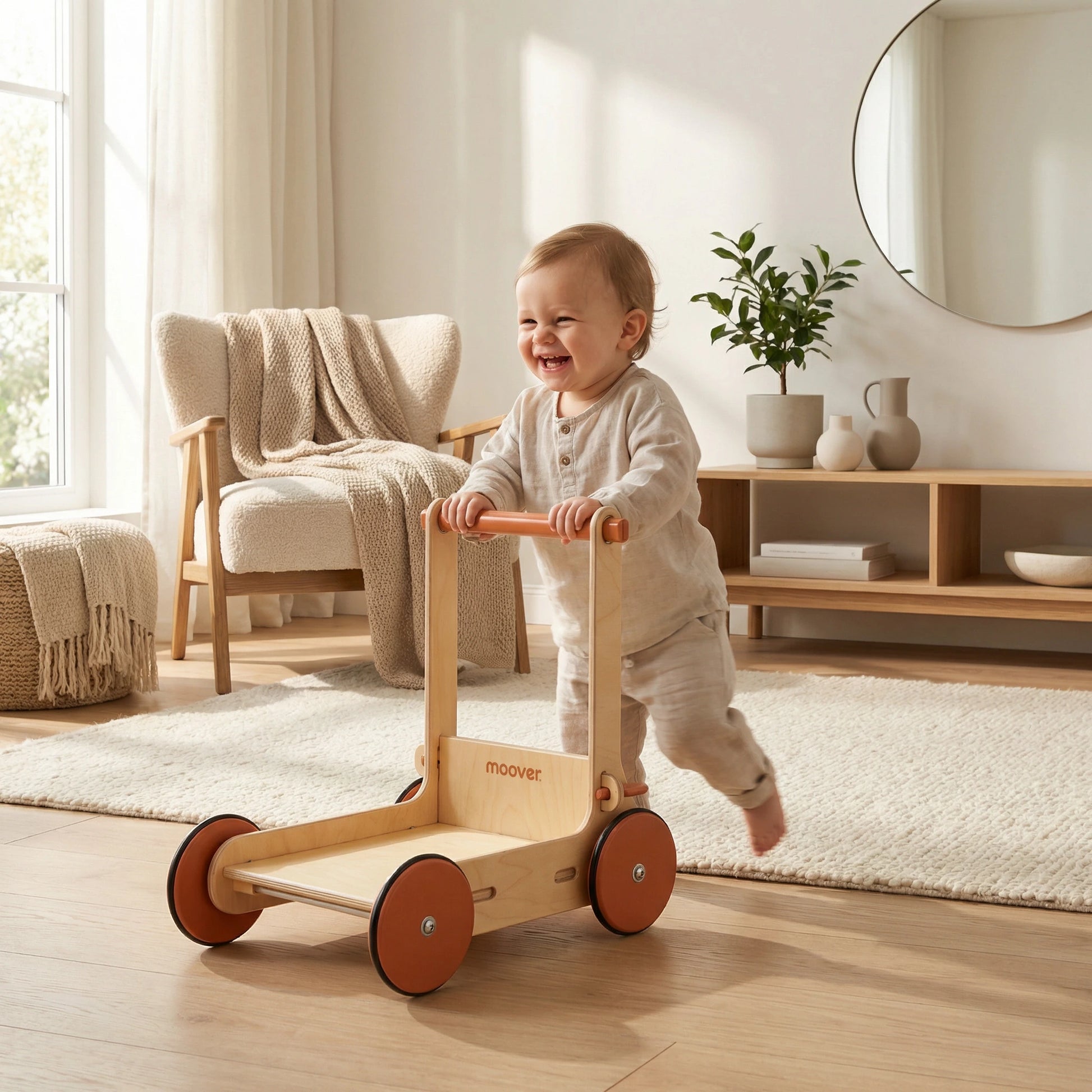 The beautiful Pink Baby Walker from Moover Toys is the perfect support for a child’s first steps. This elegant walker helps little ones develop balance and motor skills while confidently pushing it ahead. Made from FSC-certified wood and painted with non-toxic colours, it is both safe and environmentally friendly. The sturdy construction ensures durability, making it a reliable companion for those early steps.