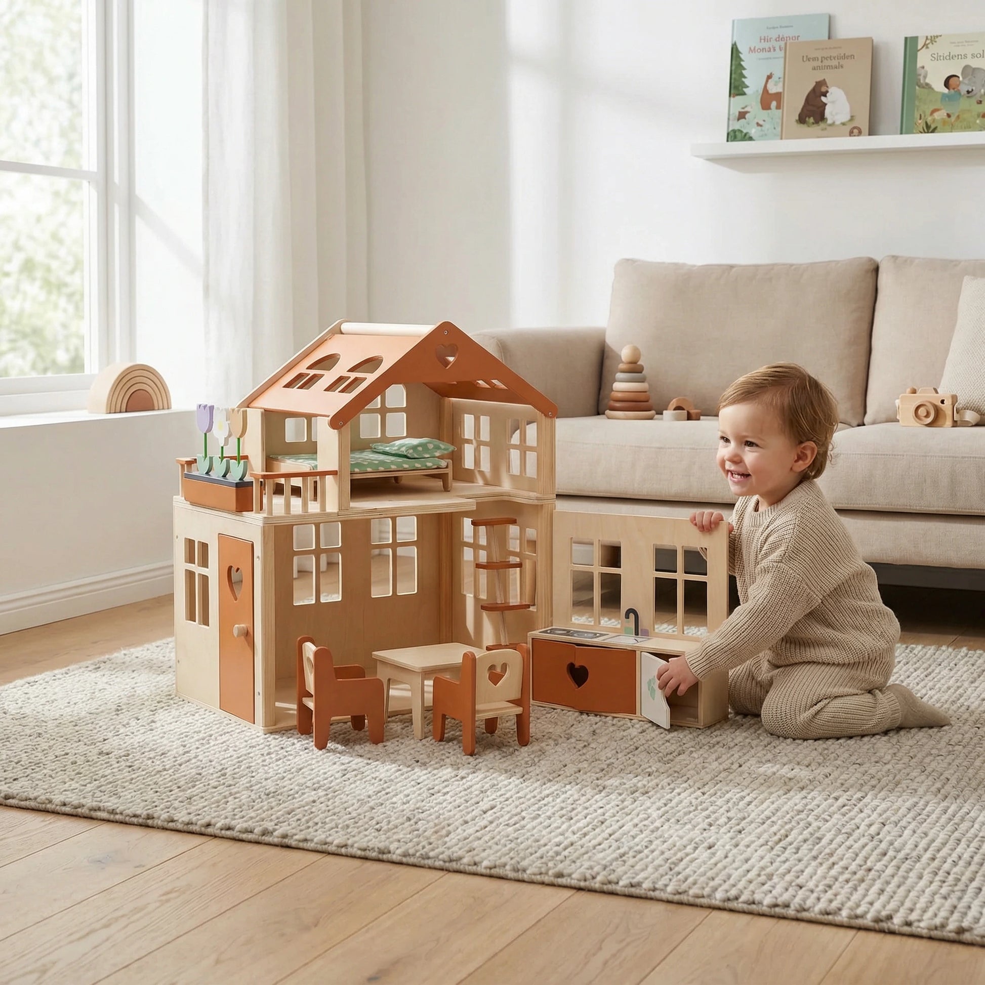 This charming brown Dollhouse from Moovertoys is a classic addition to any child's room. Designed for hours of imaginative play, the dollhouse allows children to create their own little home with dolls, furniture and accessories. The durable FSC-certified wood and non-toxic materials ensure that your child plays safely and securely, while also being a sustainable choice.